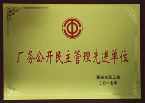 7月13日,市總工會組織召開了雅安市廠務(wù)公開民主管理專題培訓會,會上對全市廠務(wù)公開民主管理示范單位先進單位和示范班組進行了表彰,我公司被評為“全市廠務(wù)公開民主管理先進單位”,充分肯定了我公司廠務(wù)公開民主管理工作。