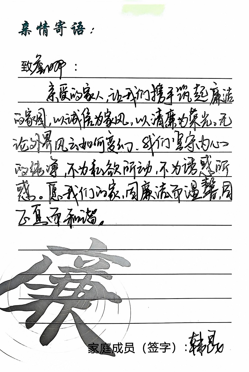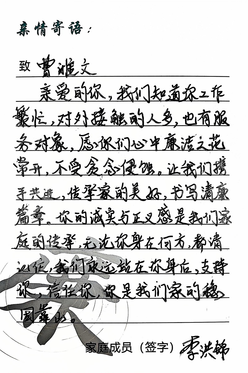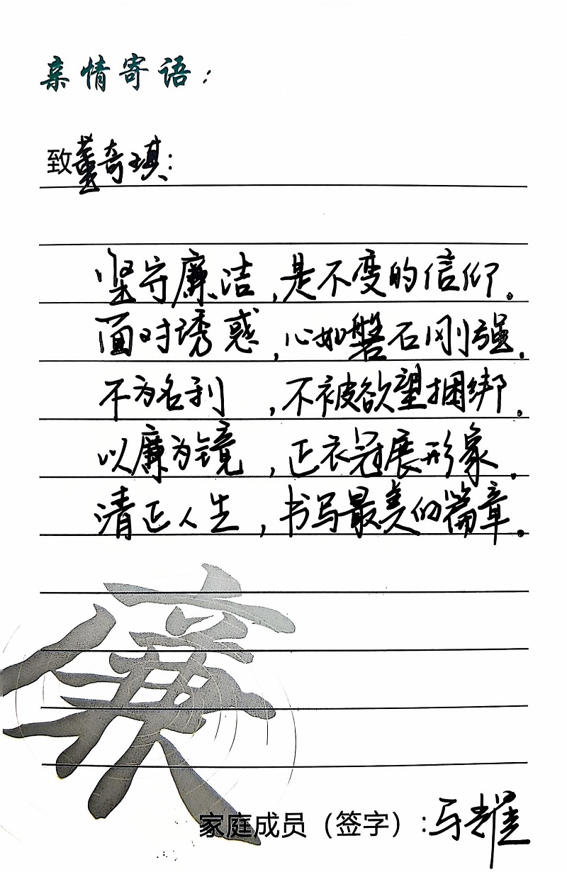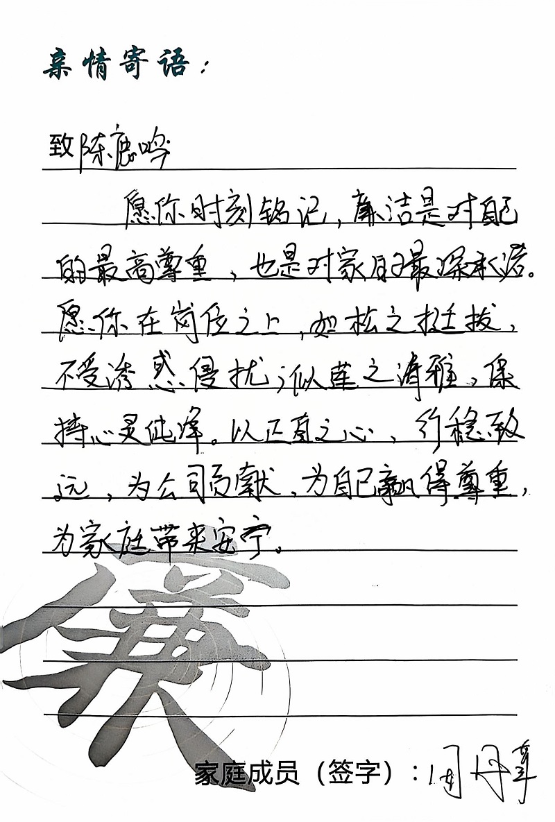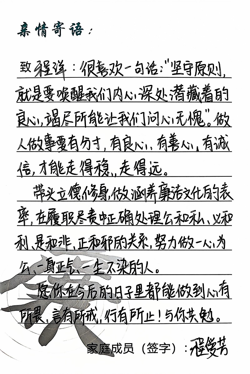 為深入學(xué)習(xí)黨的二十大精神,貫徹落實(shí)習(xí)近平總書記關(guān)于注重家庭家教家風(fēng)建設(shè)的重要論述,營造公司崇廉、尚廉、踐廉、助廉的良好氛圍,城投公司組織開展了“家滿清風(fēng)·廉潤城投”廉潔文化活動(dòng);顒(dòng)開展以來,共征集廉政寄語210余條。經(jīng)各部門、子公司推薦,城投公司相關(guān)部門審核,評(píng)選出優(yōu)秀廉潔寄語43條。現(xiàn)將優(yōu)秀廉政寄語分批次進(jìn)行展播,快來一起欣賞吧!