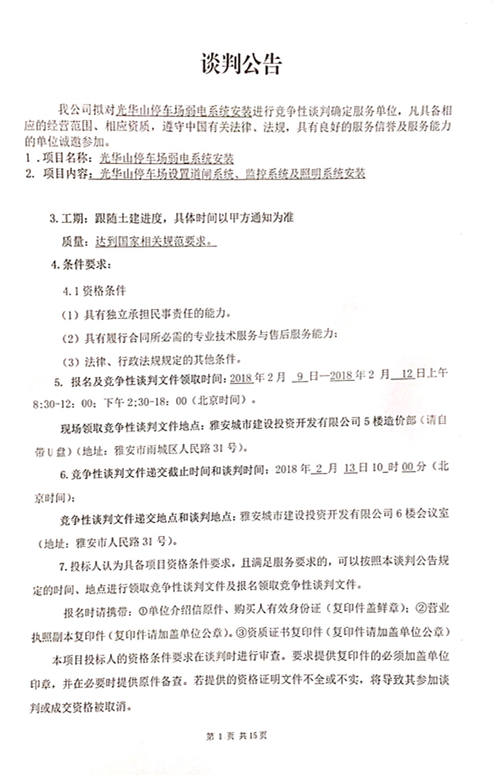 關(guān)于光華山停車場弱電系統(tǒng)安裝進(jìn)行競爭性談判確定服務(wù)單位的邀請函
