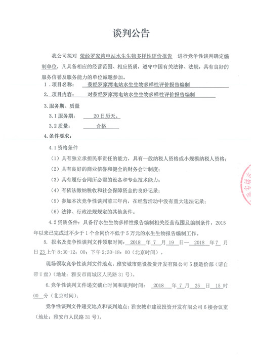 滎經(jīng)羅家灣電站水生生物多樣性評(píng)價(jià)報(bào)告編制——競爭性談判