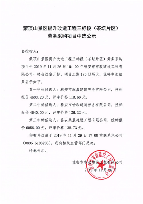 蒙頂山景區(qū)提升改造工程三標(biāo)段(茶壇片區(qū))勞務(wù)采購項目招標(biāo)中選公示