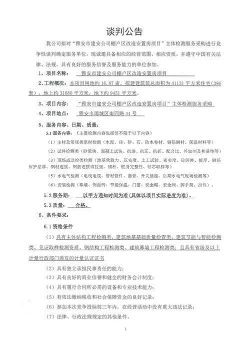 雅安市建安公司棚改區(qū)改造安置房項(xiàng)目主體檢測(cè)服務(wù)競爭性談判公告
