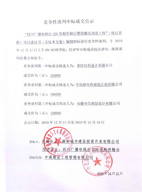 四川廣播電視臺(tái)526發(fā)射傳輸臺(tái)整體搬遷改造工程項(xiàng)目建議書(含技術(shù)方案)編制招標(biāo)競(jìng)爭(zhēng)性談判中標(biāo)成交公示
