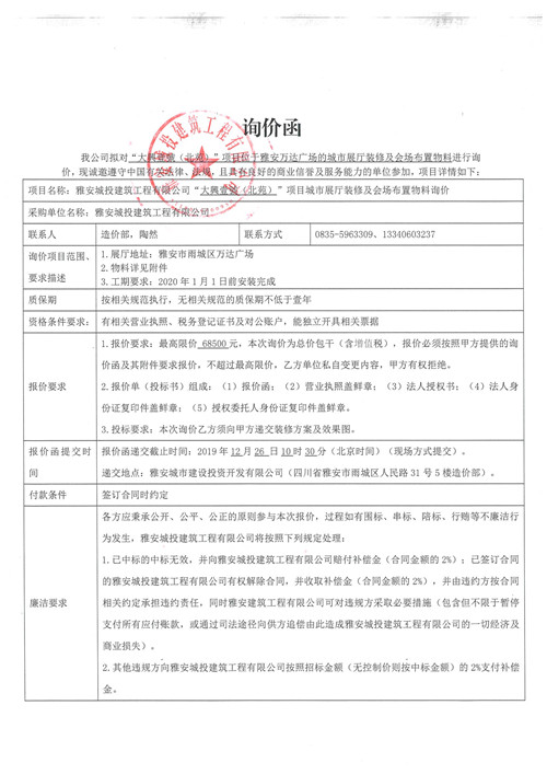 大興壹號(北苑)項(xiàng)目位于雅安萬達(dá)廣場的城市展廳裝修及灰塵布置物料詢價(jià)函