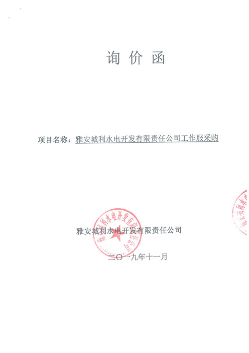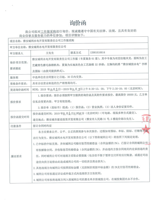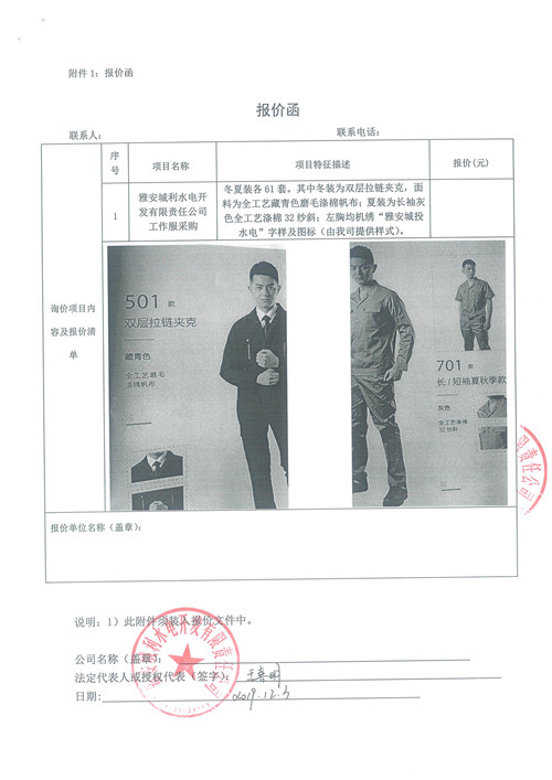 雅安城利水電開發(fā)有限責(zé)任公司工作服采購詢價(jià)函