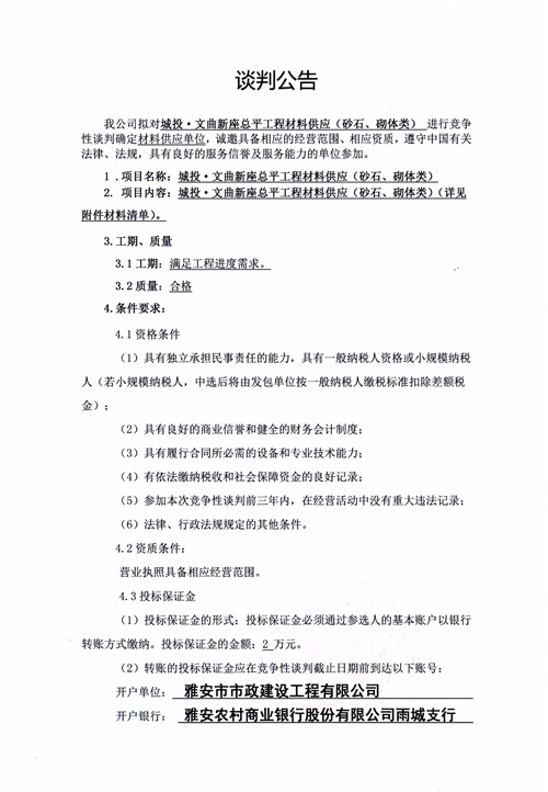 市政公司城投·文曲新座總平工程材料供應(砂石、砌體類)競爭性談判公告