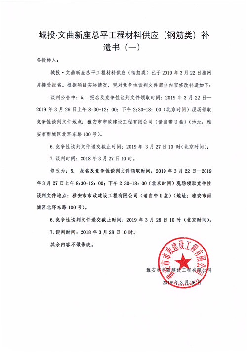城投·文曲新座總平工程材料供應(yīng)(鋼筋類)競爭性談判公告補(bǔ)遺一