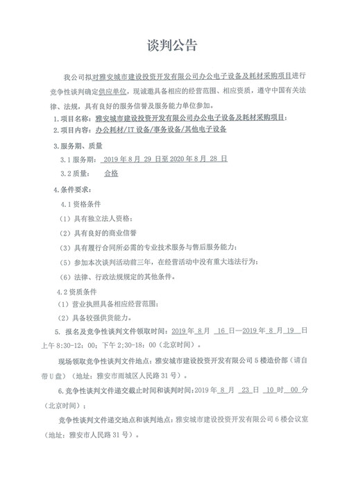 雅安城市建設投資開發(fā)有限公司辦公電子設備及耗材采購項目競爭性談判公告