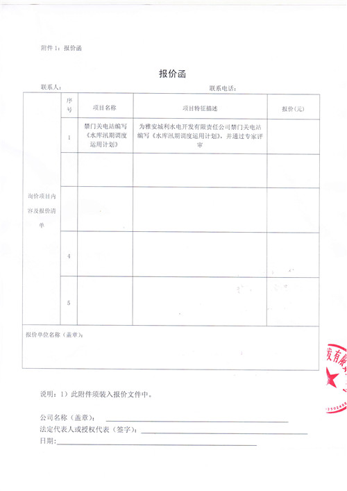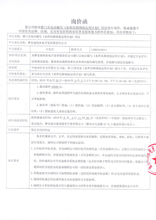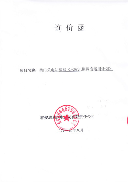 雅安城利水電開發(fā)有限責(zé)任公司禁門關(guān)電站編寫《水庫汛期調(diào)度運用計劃》項目競爭性談判公告
