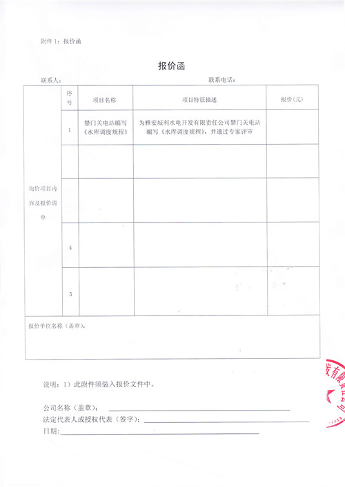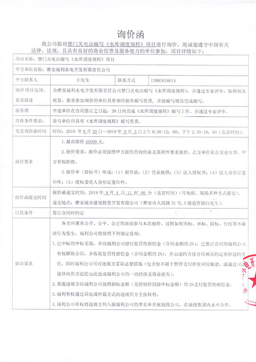 雅安城利水電開發(fā)有限責(zé)任公司禁門關(guān)電站編寫《水庫調(diào)度規(guī)程》競爭性談判公告