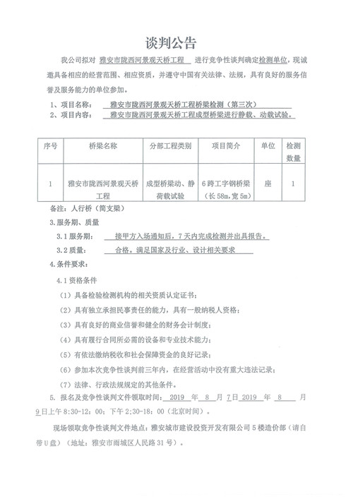 雅安市隴西河景觀天橋工程檢測競爭性談判公告(第三次)