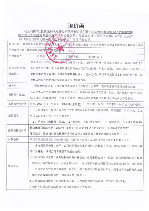 城利水電公司門坎石電站和土地溝電站《水生生物影響評價及補(bǔ)救措施專題報(bào)告》詢價函