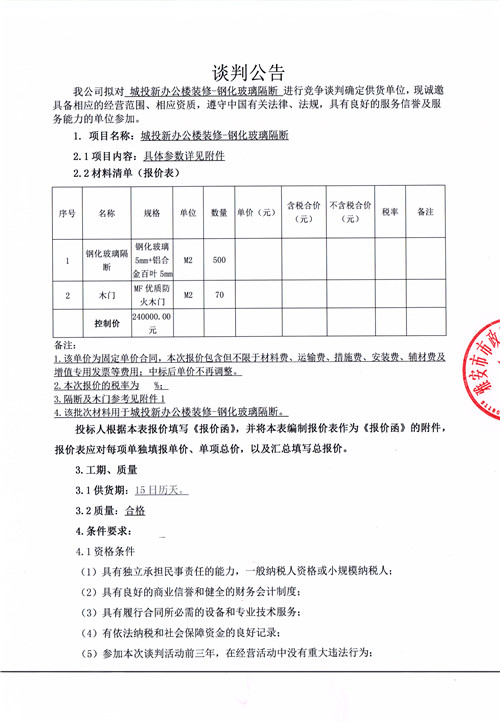 城投公司新辦公樓裝修-鋼化玻璃隔斷競(jìng)爭(zhēng)性談判公告