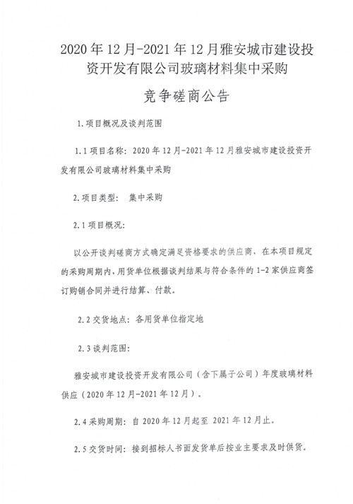 2020年12月-2021年12月雅安城市建設(shè)投資開發(fā)有限公司玻璃材料集中采購競爭磋商公告