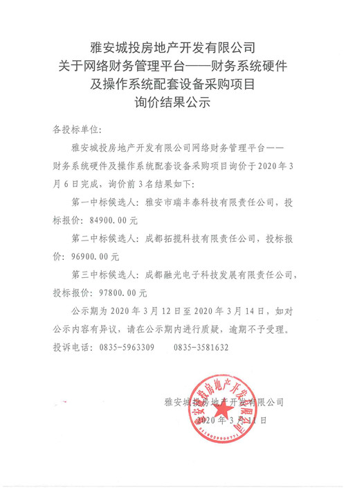 城投房地產(chǎn)公司關(guān)于網(wǎng)絡(luò)財(cái)務(wù)管理平臺(tái)——財(cái)務(wù)系統(tǒng)硬件及操作系統(tǒng)配套設(shè)備采購(gòu)項(xiàng)目詢(xún)價(jià)結(jié)果公示