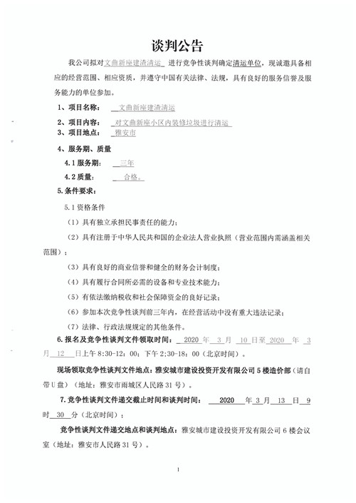 物業(yè)公司文曲新座建渣清運(yùn)確定清運(yùn)單位的競(jìng)爭(zhēng)性談判公告