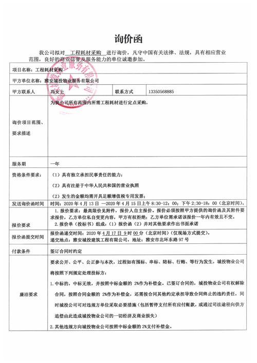 工程耗材采購(gòu)詢(xún)價(jià)函