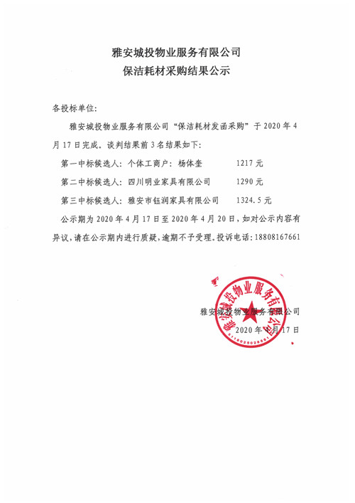 城投物業(yè)公司保潔耗材采購結果公示