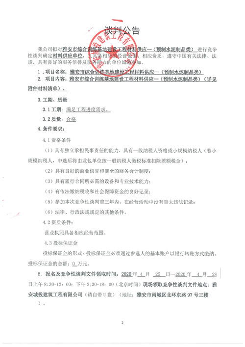 城投建工雅安市綜合訓(xùn)練基地建設(shè)工程材料供應(yīng)—(預(yù)制水泥制品類)競爭性談判公告(第二次)
