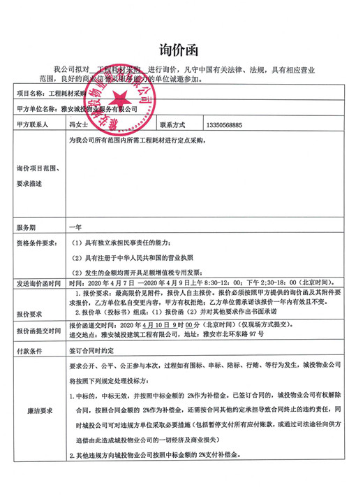 城投物業(yè)公司工程耗材采購(gòu)詢(xún)價(jià)函