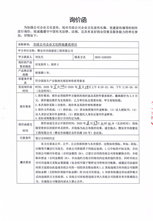 市政公司企業(yè)文化陣地建設(shè)項目詢價函