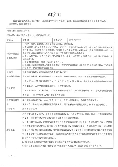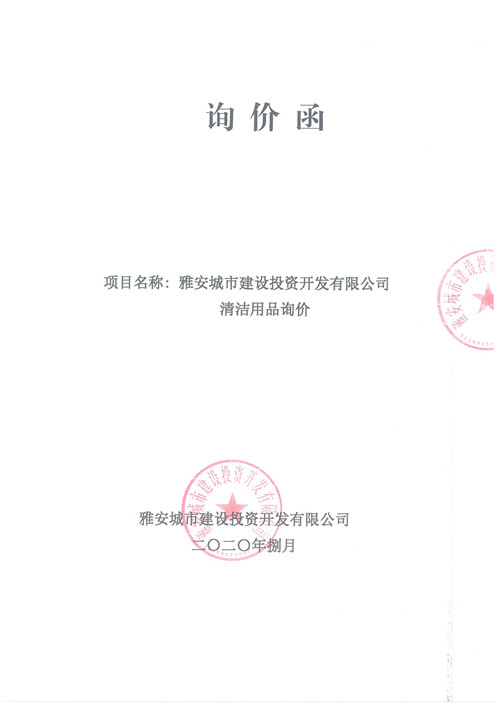 雅安城市建設(shè)投資開發(fā)有限公司清潔用品詢價(jià)函