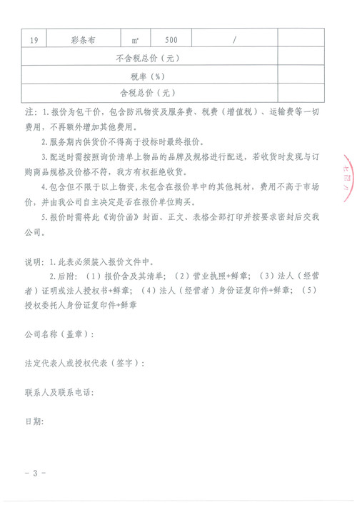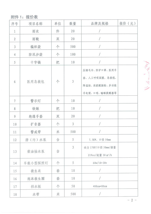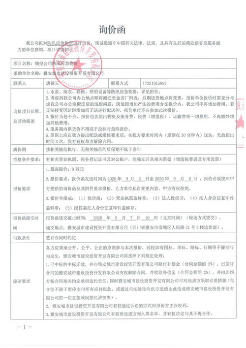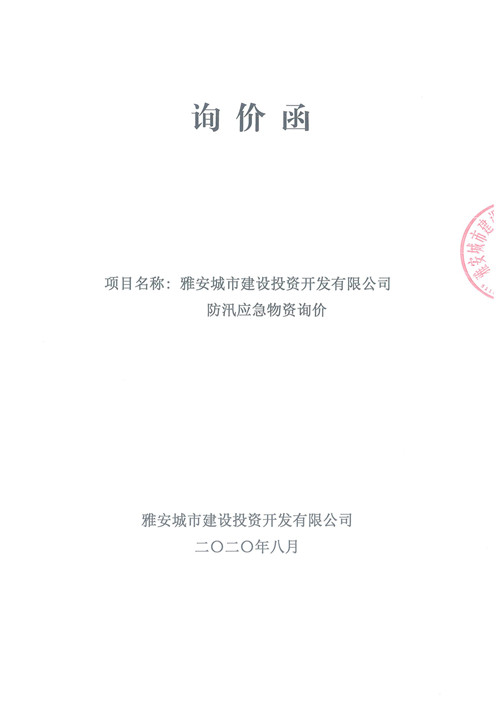 雅安城市建設(shè)投資開(kāi)發(fā)有限公司防汛應(yīng)急物資詢價(jià)函