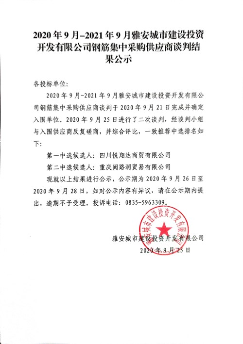 2020年9月—2021年9月雅安城市建設(shè)投資開發(fā)有限公司鋼筋集中采購(gòu)供應(yīng)商談判結(jié)果公示