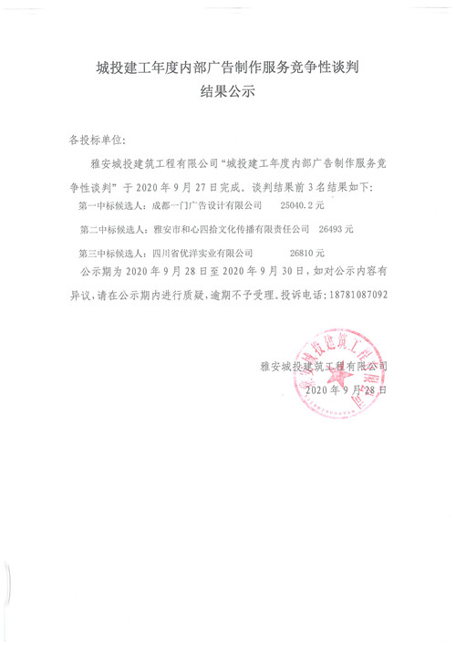 城投建工年度內(nèi)部廣告制作服務競爭性談判結(jié)果公示