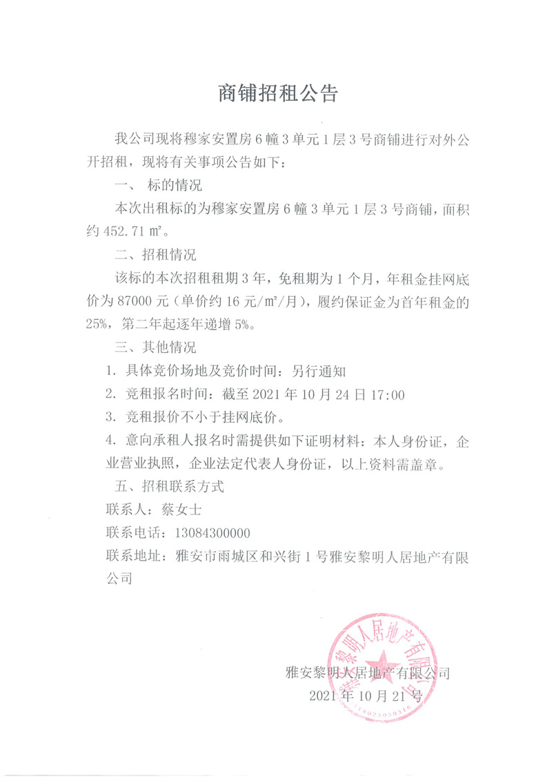 穆家安置房6幢1層3號(hào)招租公告