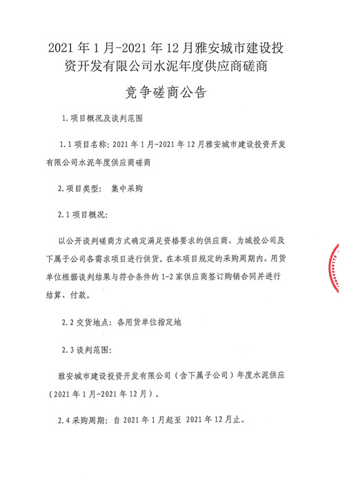2021年1月-2021年12月雅安城市建設(shè)投資開(kāi)發(fā)有限公司水泥年度供應(yīng)商磋商競(jìng)爭(zhēng)磋商公告