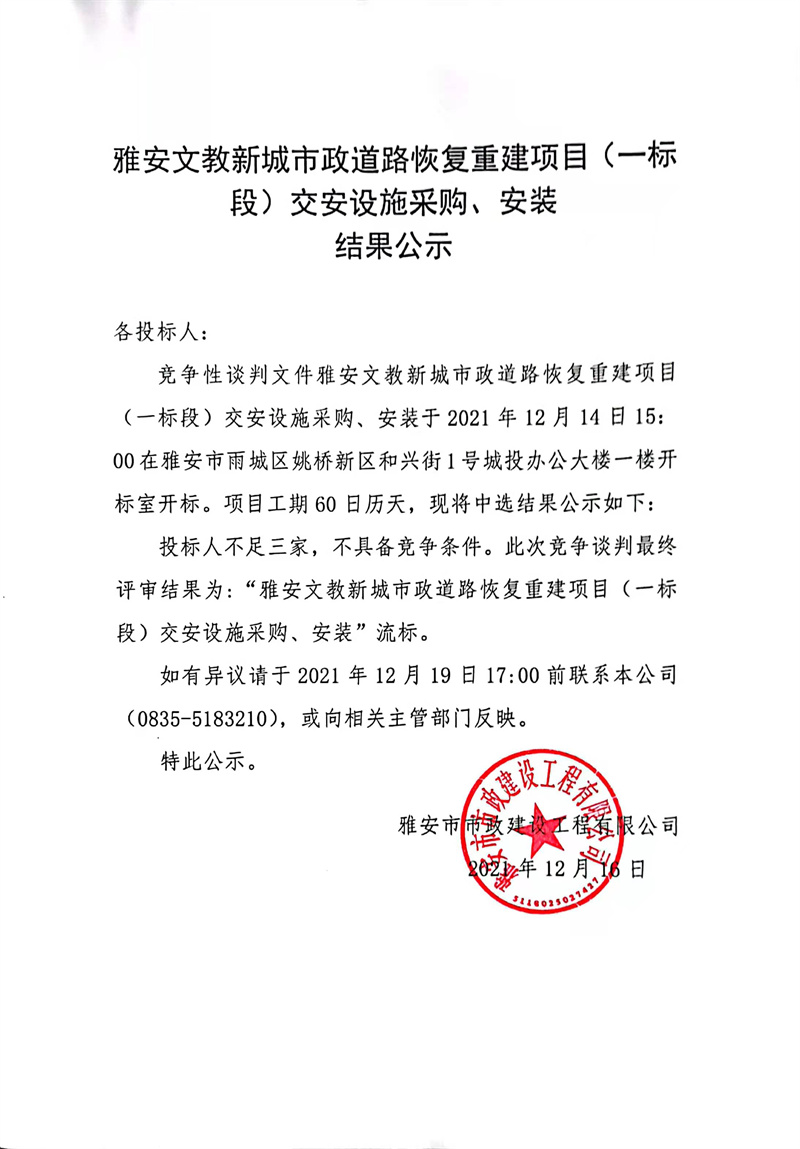 雅安文教新城市政道路恢復重建項目(一標段)交安設施采購、安裝結果公示