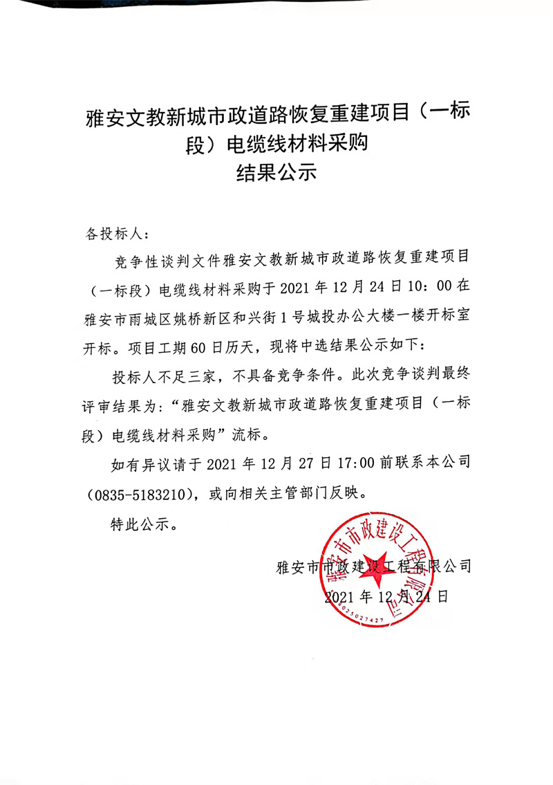 雅安文教新城市政道路恢復(fù)重建項(xiàng)目(一標(biāo)段)電纜線材料采購(gòu)結(jié)果公示