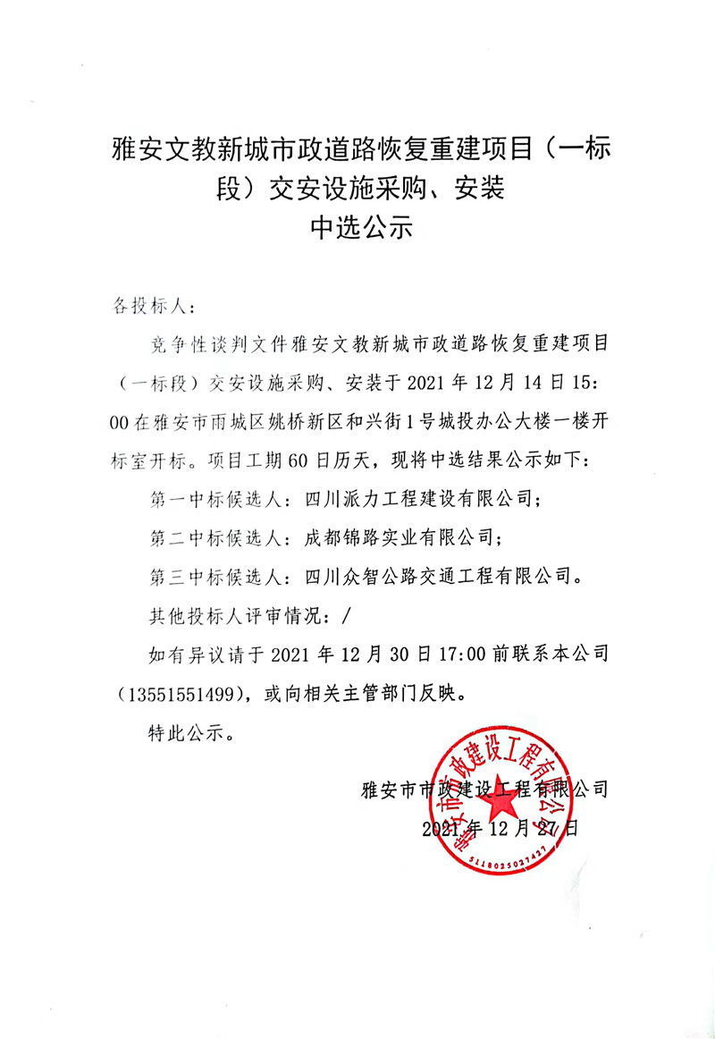 雅安文教新城市政道路恢復重建項目(一標段)交安設施采購、安裝中選公示