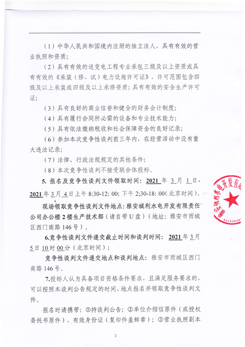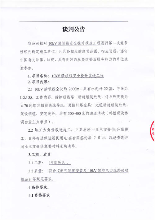 城利水電公司10kV禁壩線安全提升改造工程競爭性談判公告(第二次)