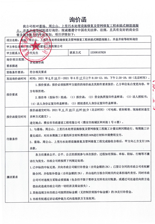 雅安城投市政公司晏場、周公山、上里污水處理設(shè)施修復(fù)及管網(wǎng)修復(fù)工程承插式鋼筋混凝土、井蓋井座等材料詢價函