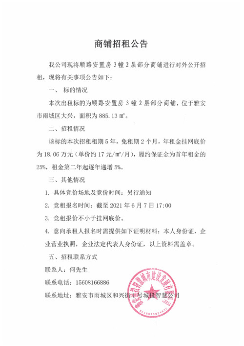城投智慧公司順路安置房3幢2層部分商鋪招租公告