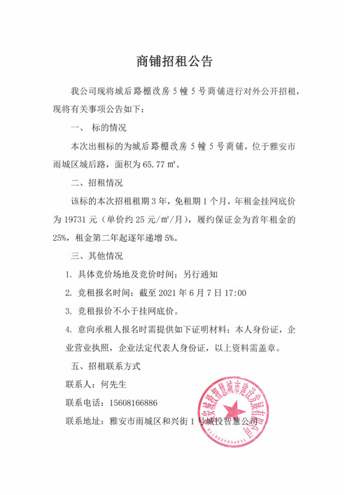 城投智慧公司城后路棚改房房5幢5號(hào)商鋪招租公告