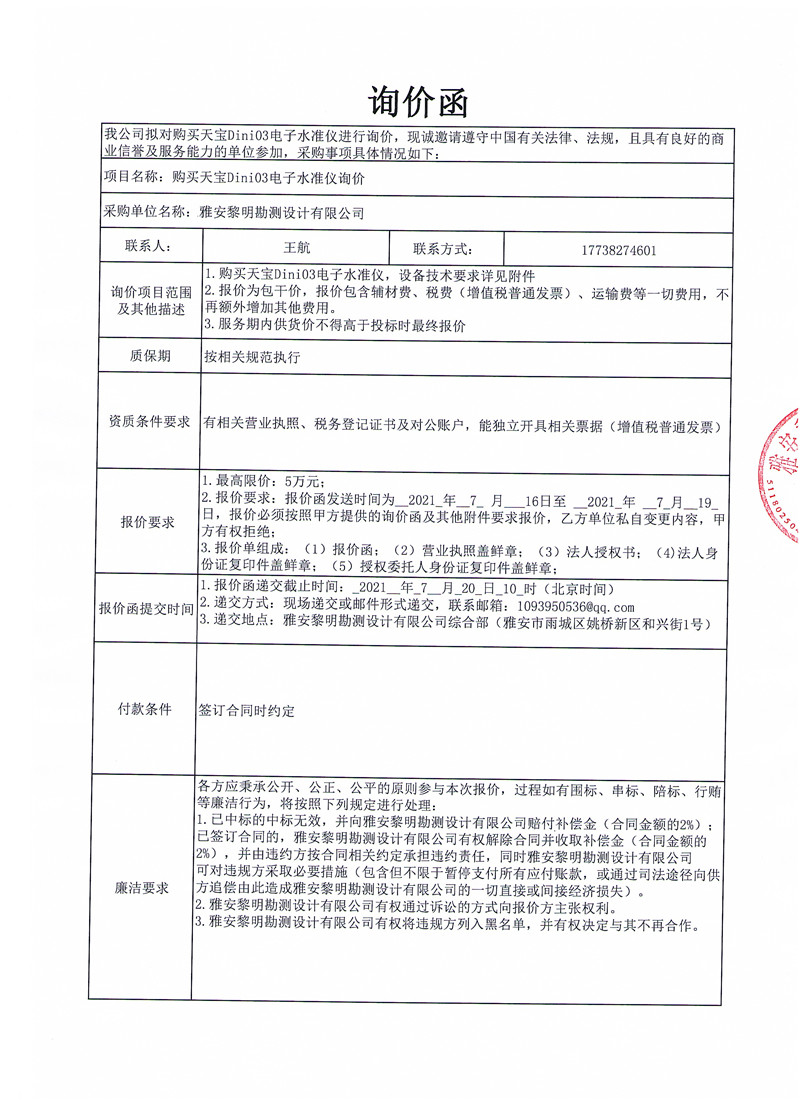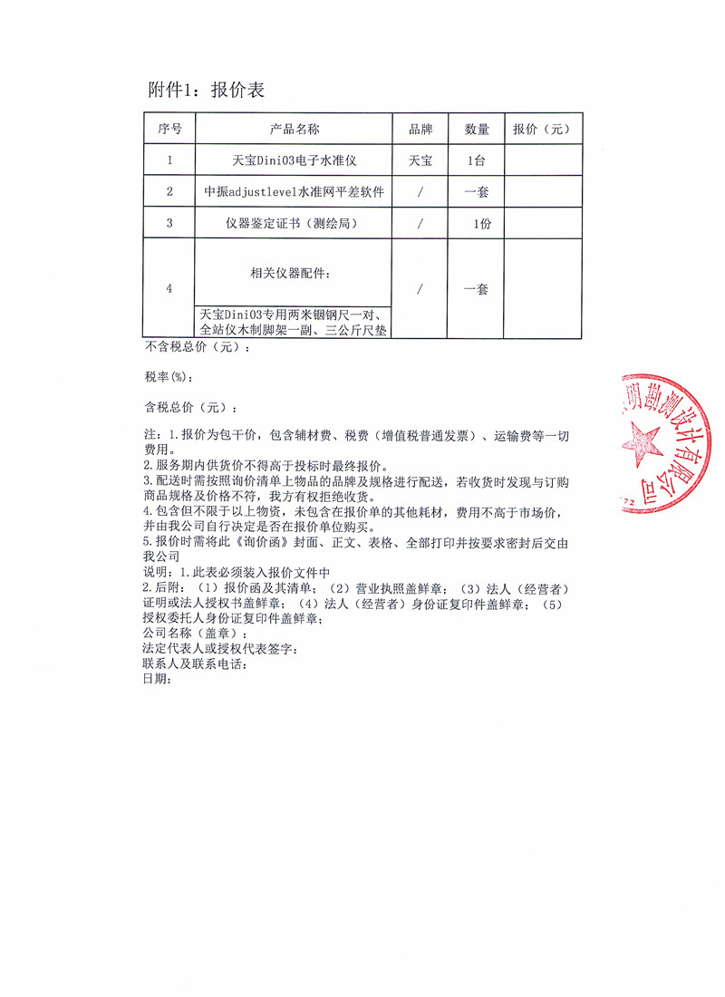 黎明勘測公司關(guān)于購買天寶Dini03電子水準(zhǔn)儀的詢價函