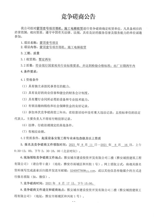 城投建工公司蒙頂壹號項目塔機、施工電梯租賃競爭磋商公告