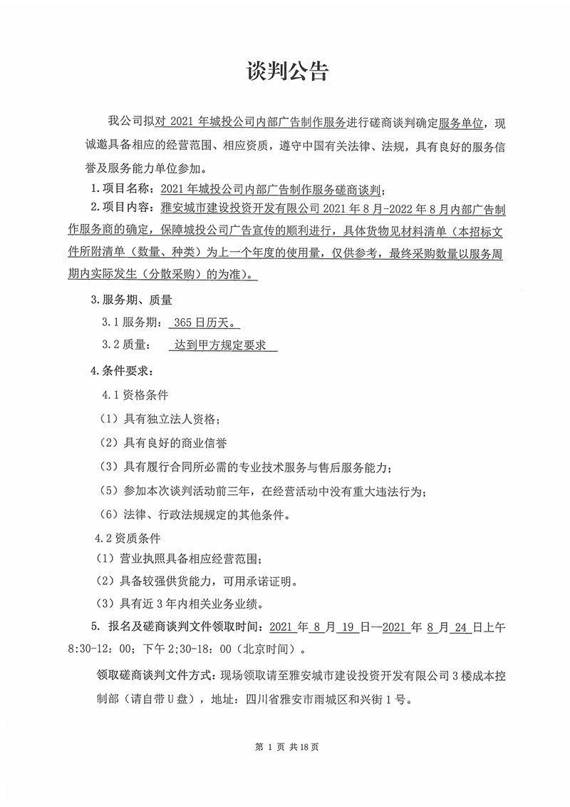 2021年城投公司內(nèi)部廣告制作服務(wù)磋商談判公告