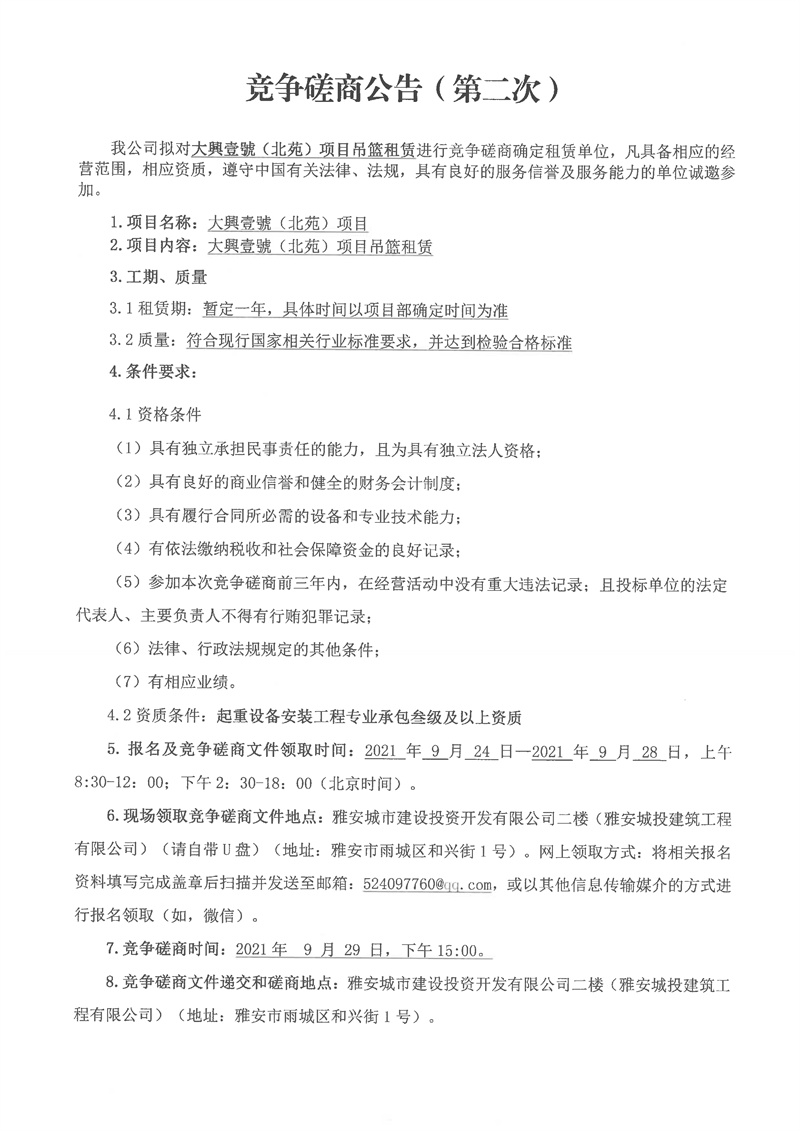 大興壹號(hào)(北苑)項(xiàng)目吊籃租賃競(jìng)爭(zhēng)性磋商(第二次)公告