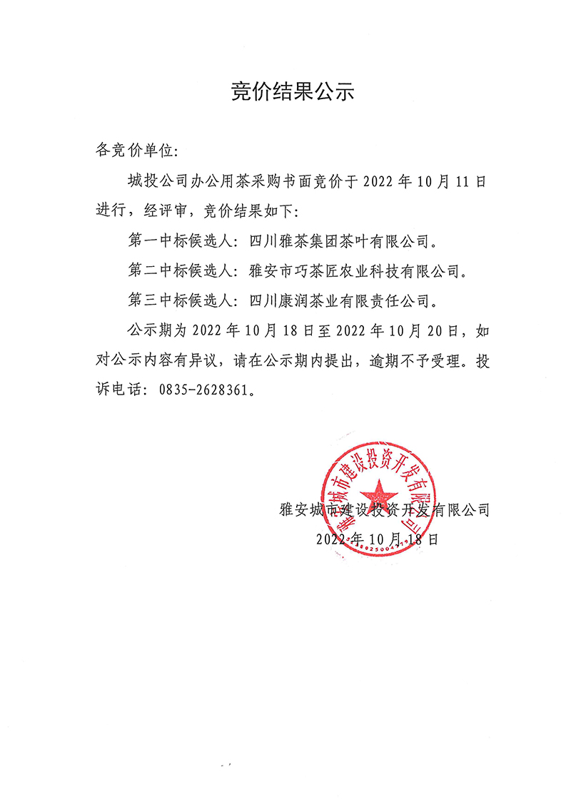 城投公司辦公用茶競價(jià)結(jié)果公示