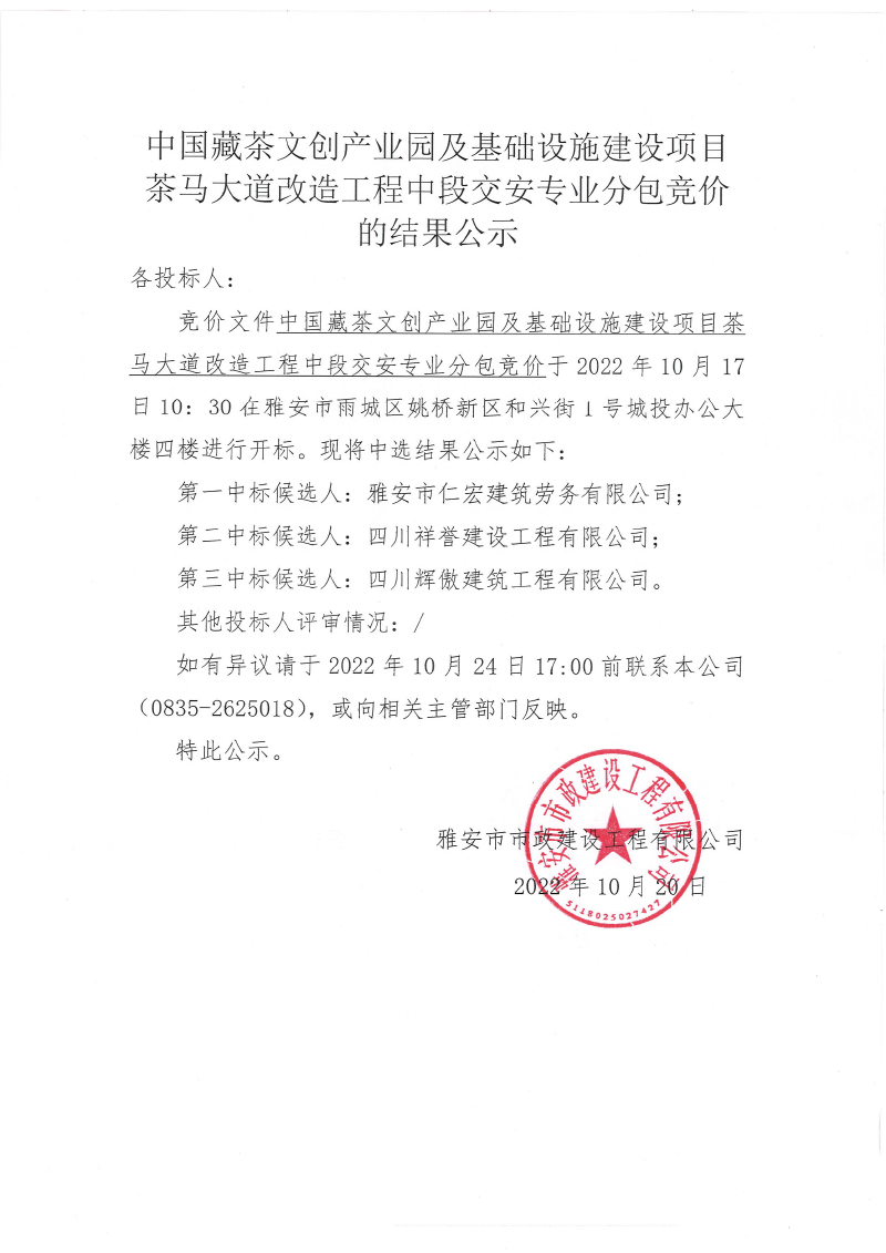 中國藏茶文創(chuàng)產(chǎn)業(yè)園及基礎(chǔ)設(shè)施建設(shè)項(xiàng)目茶馬大道改造工程中段交安專業(yè)分包競價(jià)的結(jié)果公示