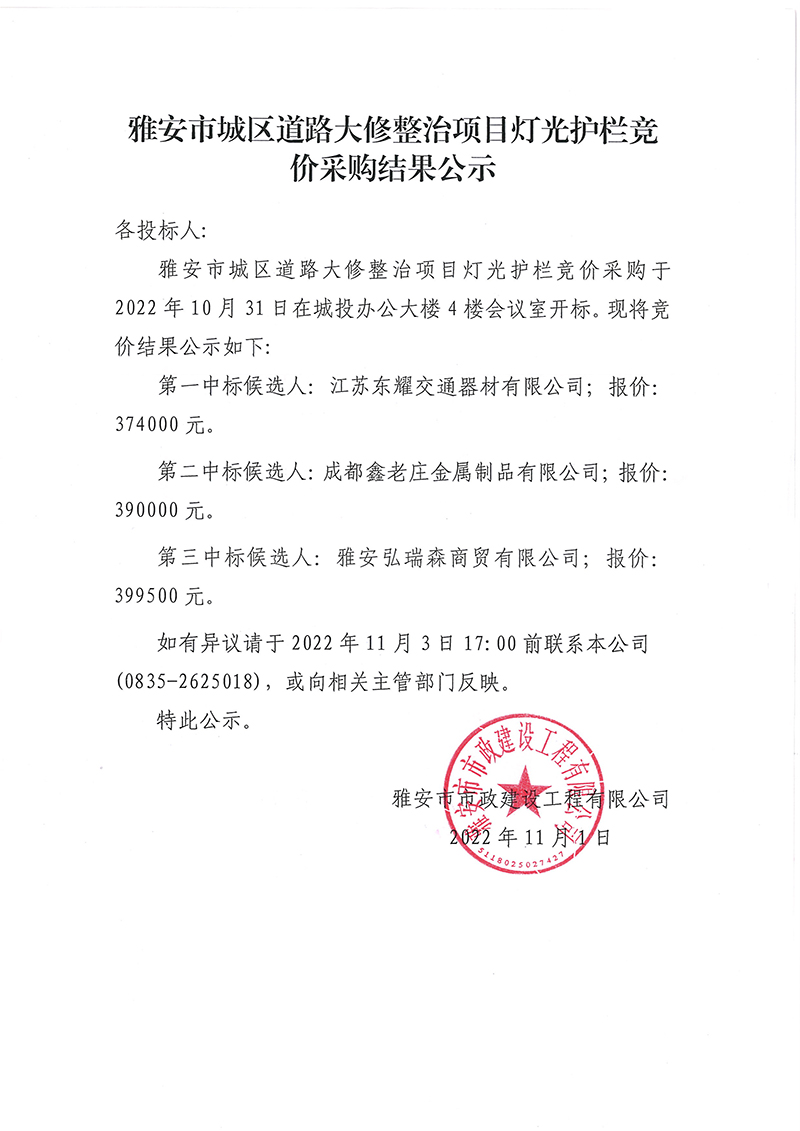 雅安市城區(qū)道路大修整治項(xiàng)目燈光護(hù)欄采購競價結(jié)果公告