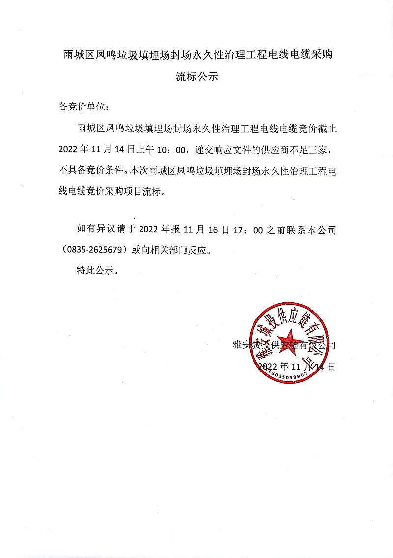 雨城區(qū)鳳鳴垃圾填埋場(chǎng)封場(chǎng)永久性治理工程電線電纜采購(gòu)流標(biāo)公示