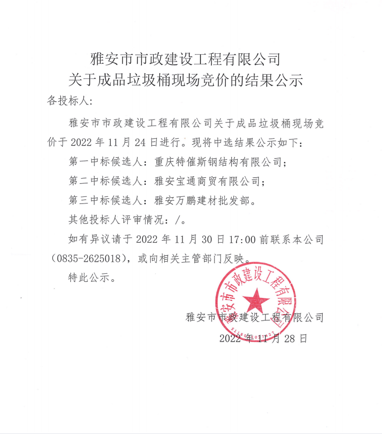 雅安市市政建設(shè)工程有限公司關(guān)于成品垃圾桶現(xiàn)場(chǎng)競(jìng)價(jià)的結(jié)果公示
