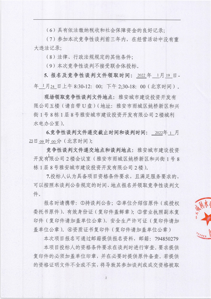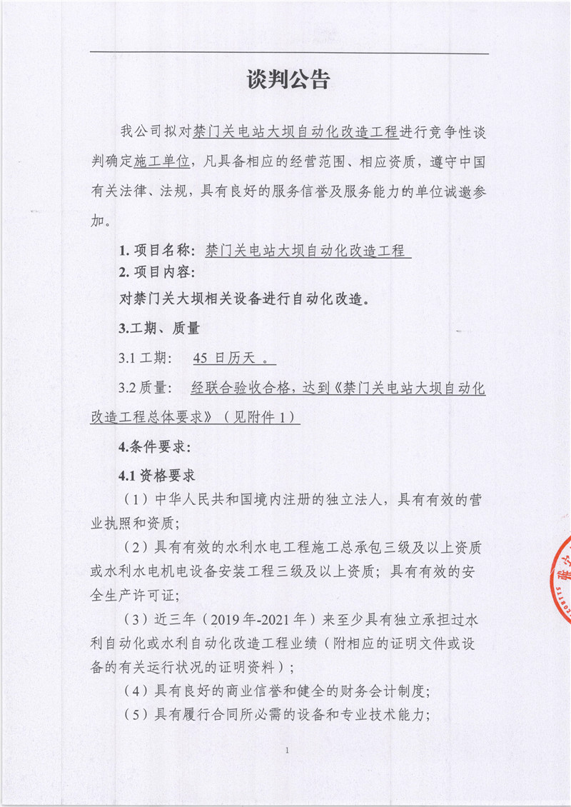 雅安城利水電公司禁門(mén)關(guān)電站大壩自動(dòng)化改造工程競(jìng)爭(zhēng)性談判公告