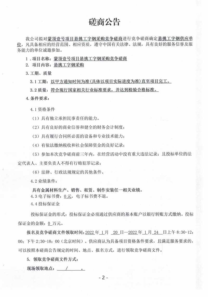蒙頂壹號項(xiàng)目懸挑工字鋼采購競爭磋商公告