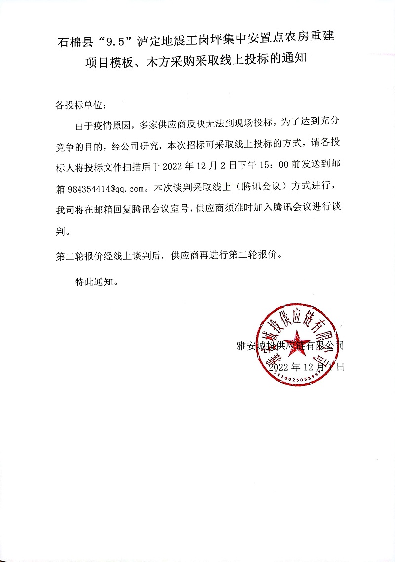 石棉縣“9.5”瀘定地震王崗坪集中安置點農房重建項目模板、木方采購線上投標的通知